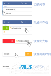 手势滑动:对选中任务左右滑动可以实现“任务完成”、“优先级设置”、“到期时间设置”、“任务移动到其他列表”等功能,还有一直按住任务就可以批量调整,小强也很喜欢这个功能。