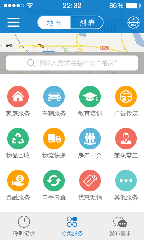 近搜是一款基于卫星定位的便民服务软件,其提供两大功能,用户足不出户查寻周围的服务提供者(搬家、维修、培训、回收等)并联系;服务提供者随时随地上线接单,创意宗旨:足不出户查找服务,闲散时间上线兼职。近搜网将助力千家万户实现效益最大化!