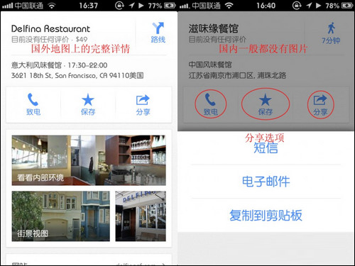 如果你登录了账号,选择天蓝色的“☆”按钮后,可以保存该地点,之后可以直接调出收藏地点。保存的右边有一个“分享”的按钮,选择之后,可以将地点以短信,邮件的方式发送出去,分享功能不需要登录账号!