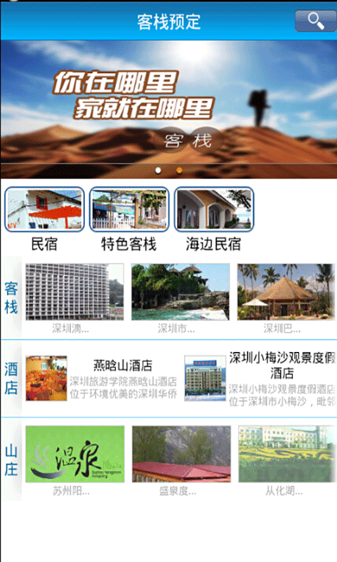 客栈预定APP客户端是移动互联网旅馆行业第一门户,专注于为广大人们外出提供最贴心的投宿服务,用户可以在本平台找到最贴心价格最合适的旅馆,本平台包含观光客栈、乡村客栈、海边客栈、客栈旅游、度假山庄、城市客栈等旅馆服务,欢迎各大旅馆加盟平台,共同致力于互联网旅馆行业的健康发展。