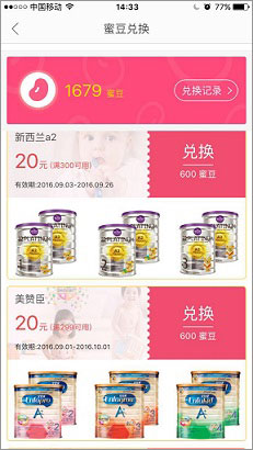 (9)会员中心,展示蜜芽等级、蜜粉值、蜜豆值及蜜豆兑换、蜜芽日记等信息,如下图: