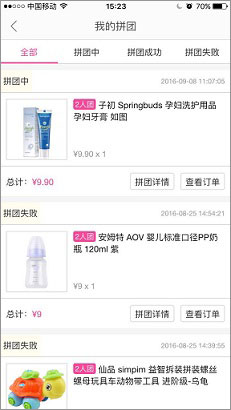 (7)我的拼团,可查看拼团中、拼团成功及拼团失败每个状态详情,如下图: