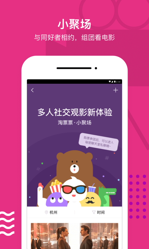 一个人看电影有多寂寞?淘票票“小聚场”了解一下 在“小聚场”里,发起或参与一个有趣的观影团,可萌可酷可专一,为了共有的童年回忆,为了偏爱的电影题材,为了喜欢的爱豆明星……何不来小聚一场? 还有参与指定影片的“小聚场”活动,购票成功后即可抽取现金红包哦