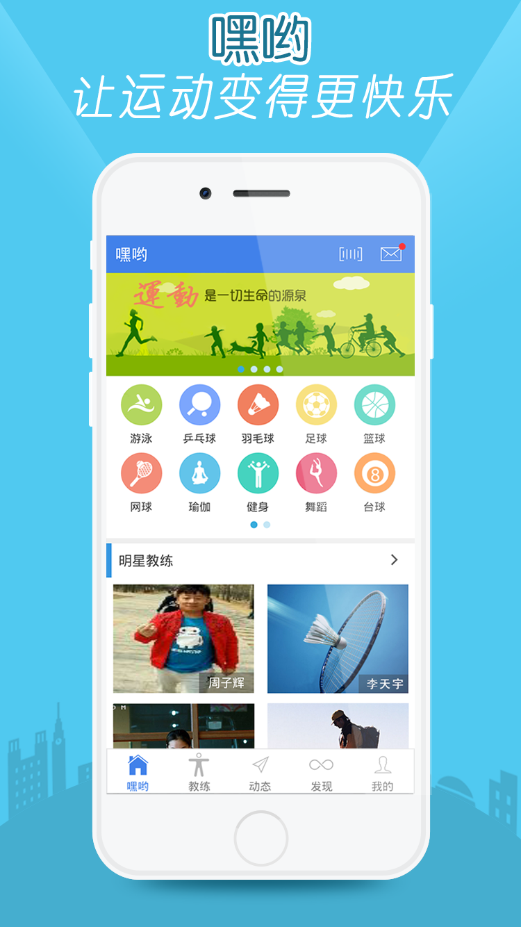 嘿哟定位为体育运动O2O平台( 教练、场馆、学员)+运动社交+数据(健康),集聚知名运动教练、优质场馆信息,在软件中,公众用户可以快速浏览教练、场馆信息,注册学员用户可以选择自己感兴趣的教练,并且支持在线报名和评价,同时可以随时随地的分享图片和文字信息,丰富的场馆支持在线预订,另外,注册学员用户可以加入找到相同爱好的圈子,在圈子中畅所欲言,注册教练可以发布自己的培训课程和管理自己的订单,实时掌握课程报名情况。