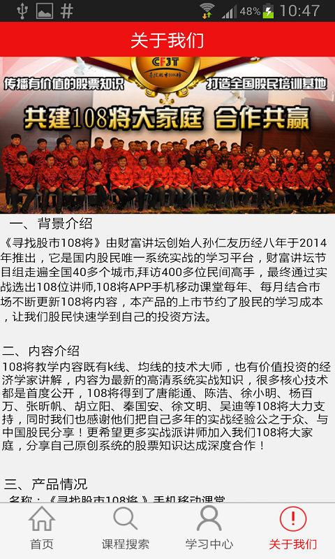 108将教学内容既有k线、均线的技术大师,也有价值投资的经济学家讲解,内容为最新的高清系统实战知识,很多核心技术都是首度公开,108将得到了唐能通、陈浩、徐小明、杨百万、张昕帆、胡立阳、秦国安、徐文明、吴迪等108将大力支持,同时我们也感谢他们把自己多年的实战经验公之于众、与中国股民分享,更希望更多实战派讲师加入我们108将大家庭,分享自己原创系统的股票知识达成深度合作。