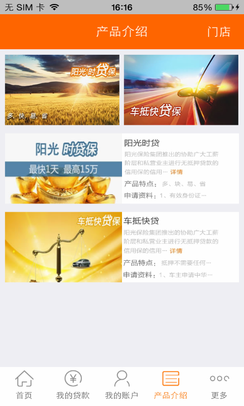 阳光速贷主要功能包括登录、注册、忘记密码、 找回密码,修改密码,贷款申请,提前还款试算、贷款进度查询、我的账户相关信息,以及附近门店地址、电话 ,产品介绍等;此APP使用便捷,操作简单,减少了用户不必要的学习成本,为新老客户提供了良好的手机应用服务。