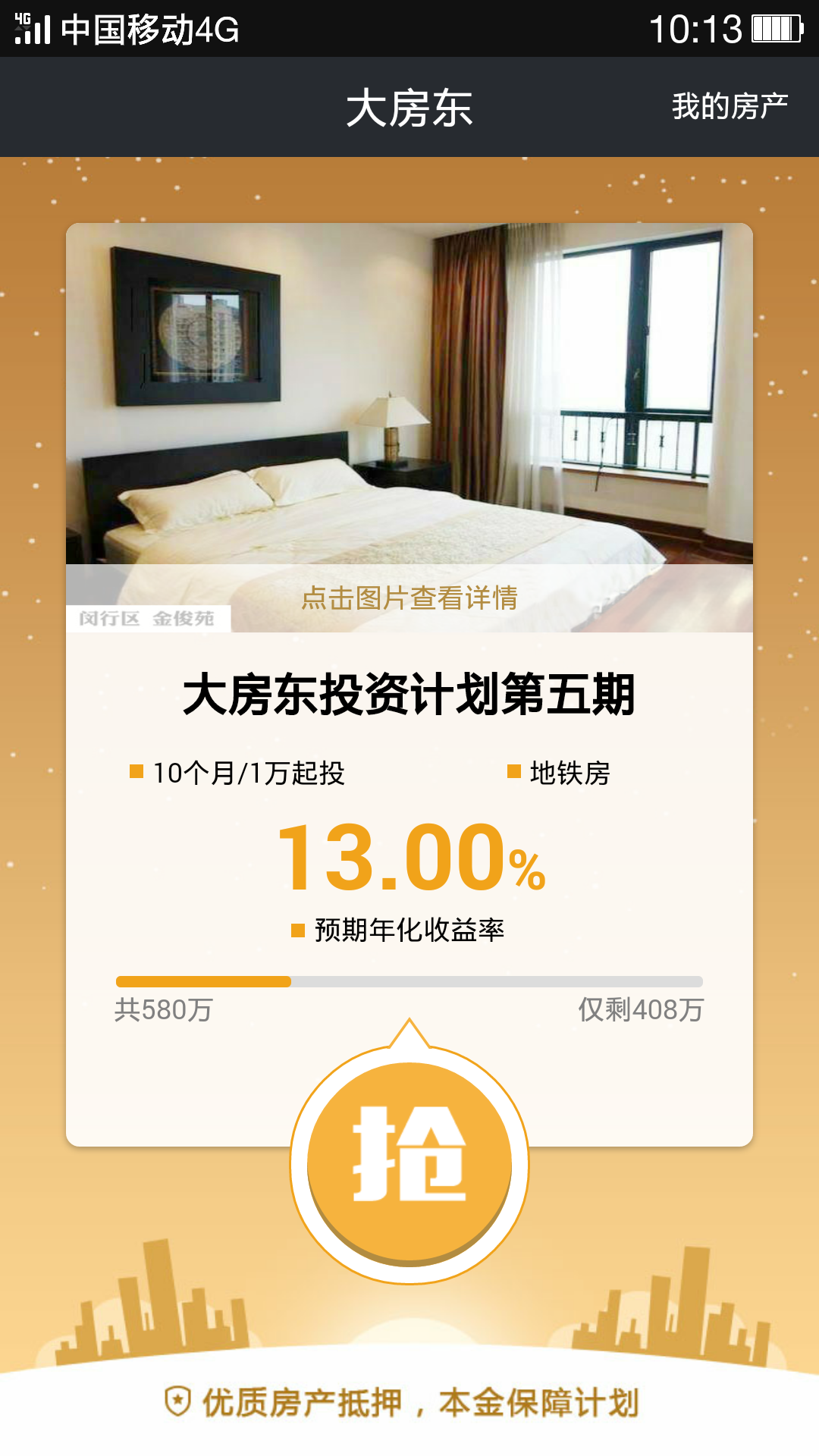 大房东投资app安卓手机版是一款专为个人及小微企业主提供快速,透明,安全的借款服务的手机房产投资软件,0.99%超低月息、快速、便捷、安全、预期年化收益率最高可达13.88%,上海优质房产,本金保障计划,为借款人及投资人搭建安全、透明、便捷的对接通路,所有投资均为优质房产抵押项目,由立信中诚房产估价公司专业评估、东方公证处合同公证、盈科律师事务所证据存管,面向高端投资人群,提供稳妥、安全的投资回报。