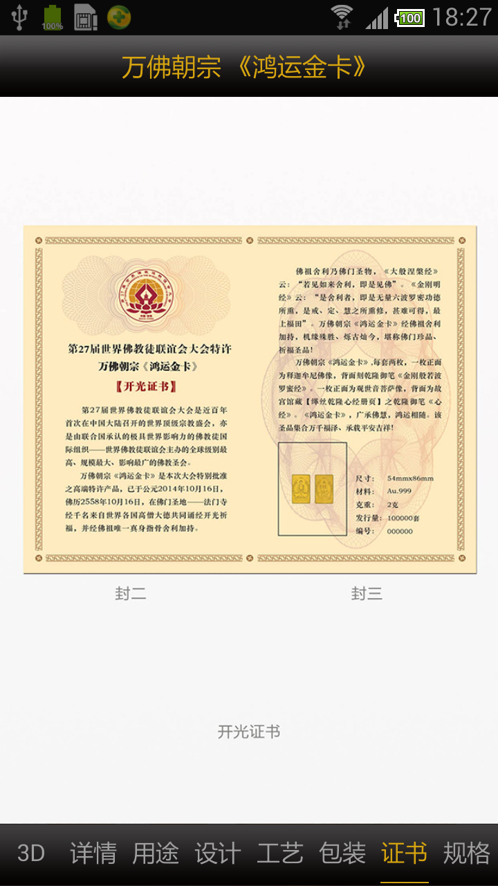 鸿运金卡主要用于展示,3D部分可以全面看产品,点击详情可以看关于产品的详细信息,点击用途可以看产品的具体用途,设计可以看产品的设计详情,点击工艺可以看产品的主要加工过程,点击包装可以看产品的包装信息,点击证书可以看产品的证书信息,点击规格可以看到产品数据方面的信息。