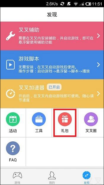 3、在“发现”页面点击“礼包”入口,进入礼包中心领取。