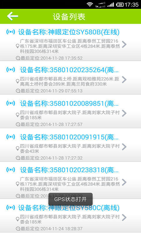 5.设备列表,显示当前用户登录的授权设备,比如儿童手表、贴身保,车载设备等,选择某一个终端的时候,将跳转至地图界面,显示该设备所处的位置,选择扩展按钮的时候,显示该终端的详细信息。