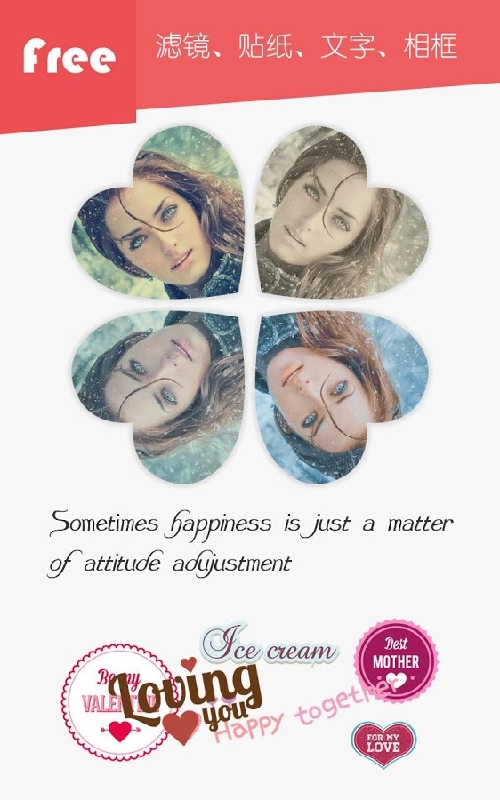 爱拼贴是将多张照片自由拼贴成惊艳的相片组合的软件,你可以使用自由裁剪和形状模板把你的照片裁剪成你喜欢的样式进行自由拼贴,独创的羽化、阴影、滤镜等效果让你的照片更加独特,大量免费的贴纸、文字、相框让你的照片更加精美。