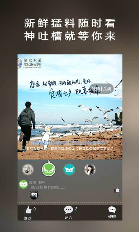 碰密是一款基于匿名社交圈而开发的移动交友产品,通过碰密手机客户端,用户可以在“匿名”的状态下进行信息分享,在拥有足够私密性的环境中畅所欲言,有别于一般的匿名社交产品,软件具有较强的针对性,以“八卦神器”为主打的“碰密”则恰恰提供了这样子的一个平台,八卦消息乃人们日常生活的消闲品之一,人们在休闲生活中总爱关注各种各样的八卦消息。