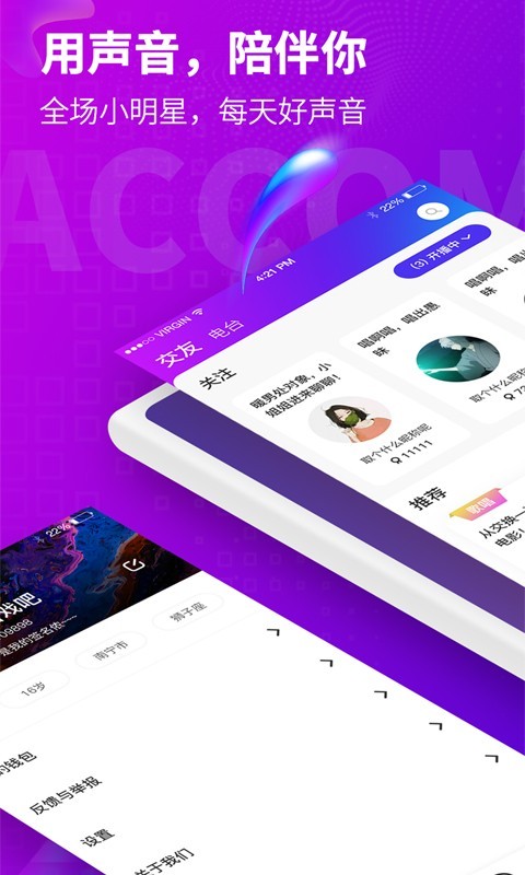 爱玩的语音社区,甜美开嗓,专属陪伴,即刻发声,寻找属于你的cp,为你搭建专属通道,消除男女屏障,多人语音互动,嗨夜不停,用声音认识你。轻声细语,娓娓动听,喜欢她就pick她!