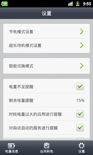 安卓手机必备的节电软件,适用于电池续航能力弱,待机时间短,常折腾手机却苦于耗电太快不能畅快玩的安卓手机用户。主要通过节电模式来便捷控制一些耗电的硬件和设置项,并且智能提醒当前耗电的程序、后台恶意启动的服务等,从而最大限度提高待机时间,可有效节约高达50%的电量。