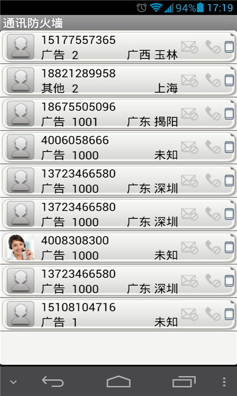 通讯防火墙可以通过设置黑名单的电话号码、短信关键字、电话区域,来达到屏蔽骚扰电话和短信的目的,同时用户可以设置白名单保证特定号码电话或短信的接收,同时还增加了云服务,用户可以举报指定的黑名单号码到服务器,也可以整体同步黑名单和白名单的号码到服务器,然后通过账号再从服务器同步回到手机终端。