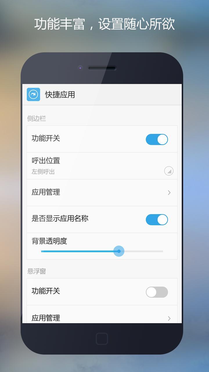 快捷应用是为用户量身定制的一款系统工具,可以在应用设置里面把你经常使用的应用添加到侧边栏里,每次通过呼出侧边栏来打开应用程序,它可以减少操作步骤,提供快捷方便的使用方式,随时随地任意开启应用,操作简单,使用便捷。