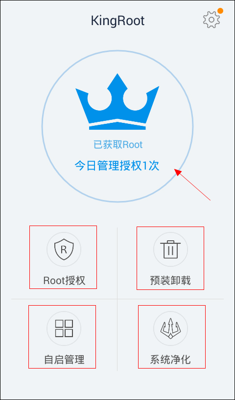 1、首先,我们先打开KingRoot,你会发现页面布局很简单,有四个模块,分别是:Root授权,预装卸载,自启管理,系统净化。我们先来打开中间的标识,如图2所示,会显示今天KingRoot只能管理的软件,是不是很强大呢。