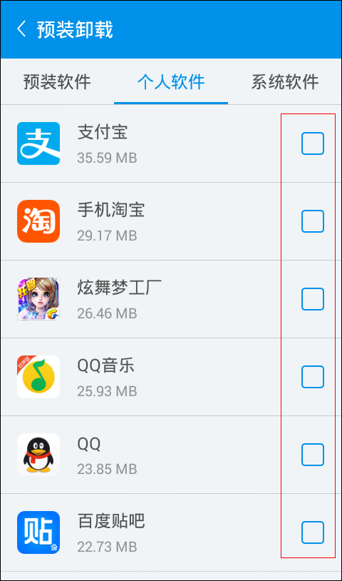 3、预装卸载可以将手机内所有的软件都能够卸载,有些长时间不用的软件可以打钩进行卸载,如下图。