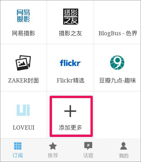2、在zaker中上滑已订阅的内容,然后点击添加更多按钮。
