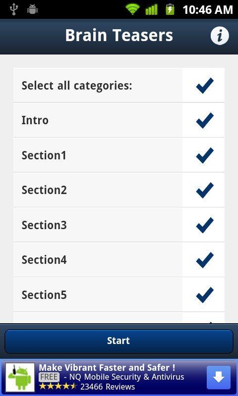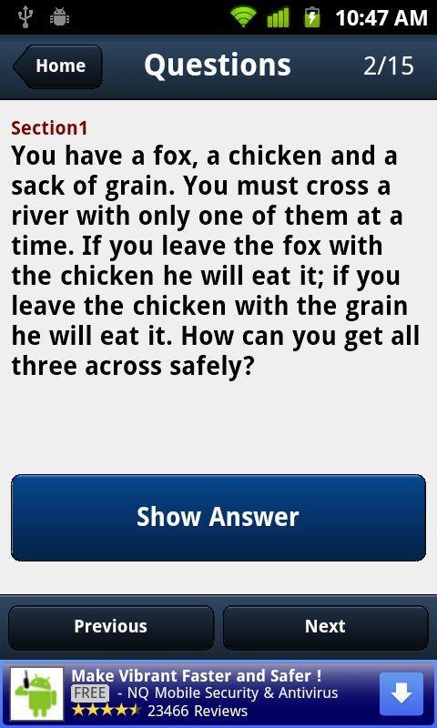 Tips: Application will first show the Brain Teasers (problem ) only. Take your time to solve the problem by yourself first. After that you can click on Answer button to see the actual answer.Sample Brain TeaserQ.) You have a fox, a chicken and a sack of grain. You must cross a river with only one of them at a time. If you leave the fox with the chicken he will eat it; if you leave the chicken with the grain he will eat it. How can you get all three across safely?Ans) Take the chicken over first. Go back and bring the grain next, but instead of leaving the chicken with the grain, come back with the chicken. Leave the chicken on the first side and take the fox with you. Leave it on the other side with the grain. Finally, go back over and get the chicken and bring it over.