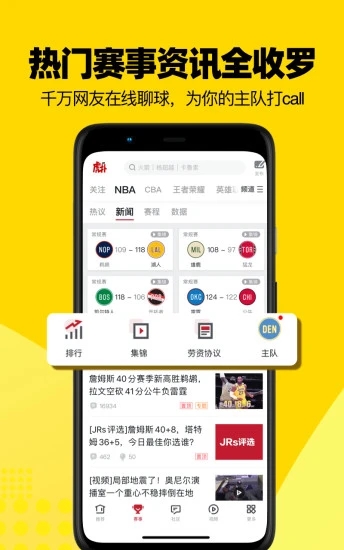 获得关于篮球与足球的一切:看NBA、CBA、路人王、中超、欧冠、英超、西甲、德甲、意甲、法甲、世预赛、欧联等赛事的新闻、直播、视频、数据,与专业又不失有趣的 JRs 讨论、分享和学习实战经验,购买正 品低价运动装备等。