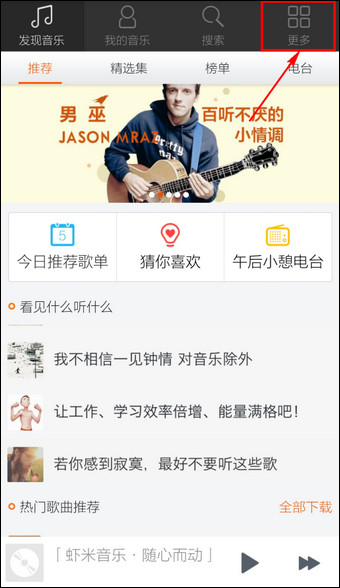 1、打开手机虾米音乐,点击右上角的【更多】。