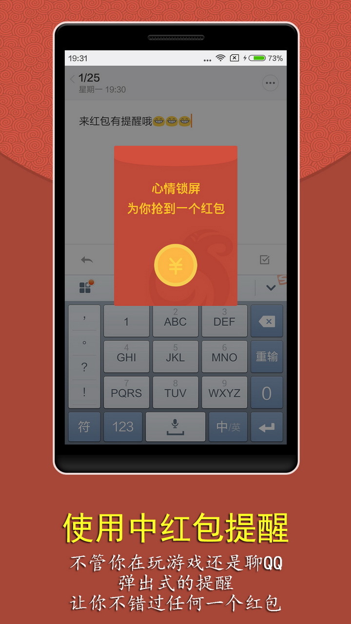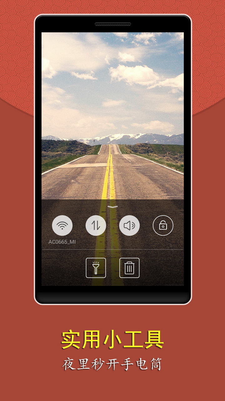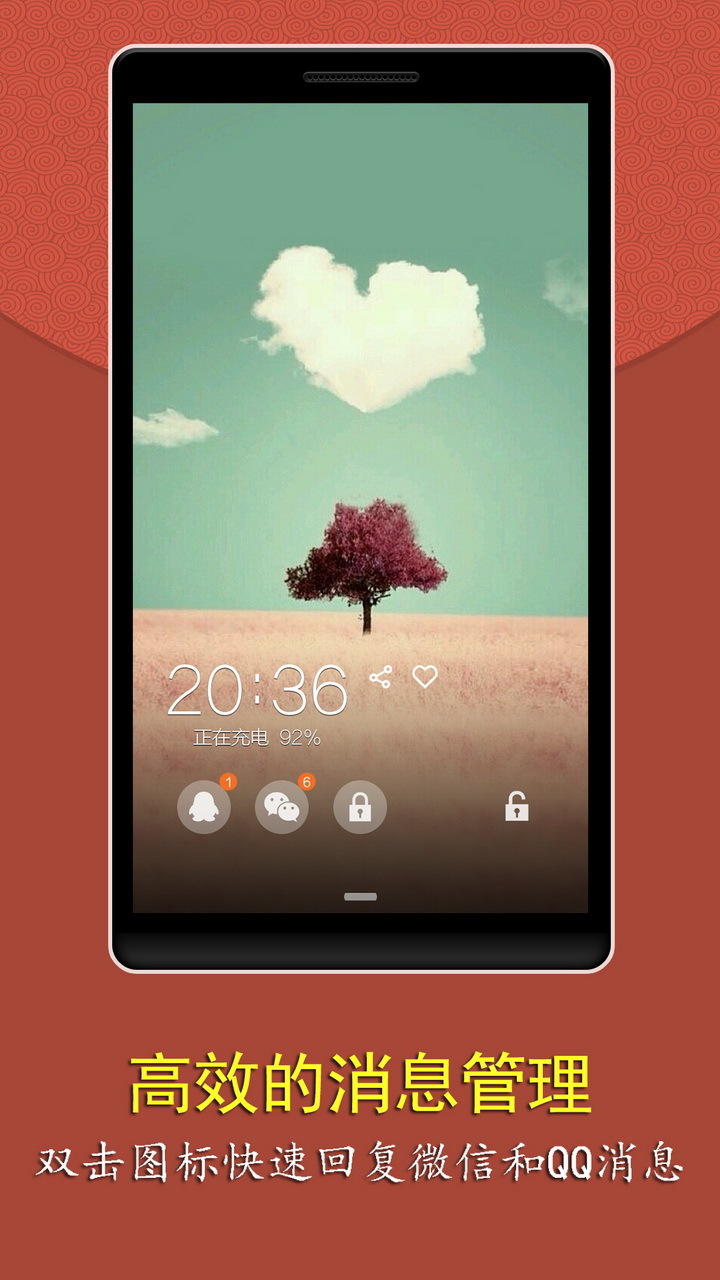 心情锁屏,自带锁屏红包提醒功能,让你不错过任何一个红包,抢红包快人一步!锁屏美图每日更新,解锁有惊喜,每次解锁都会看到不同的壁纸,对一成不变的锁屏说再见。壁纸精挑细选,每日自动更新。高效的消息管理,在锁屏上显示微信、QQ消息,双击快速回复,真正做到秒回消息。在锁屏上集成手电筒等实用小工具,夜里秒开手电筒。