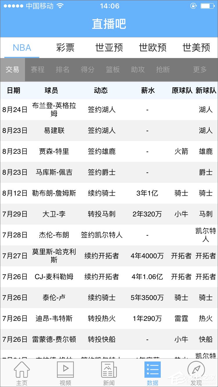 7、“数据”版块为用户提供球员最新数据、签约球队,预选赛比分等等;