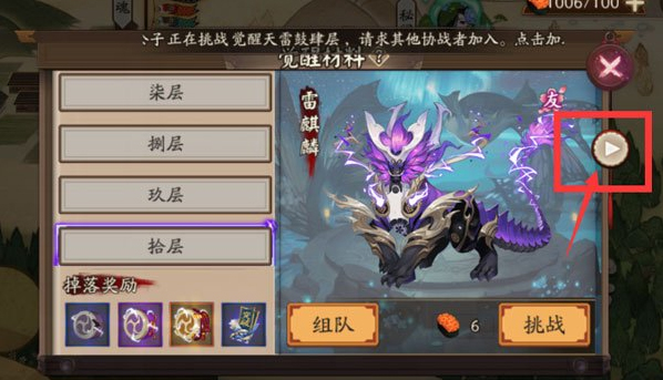 2、在御魂、觉醒10层,秘闻挑战本的8层(山兔本除外)、9层、10层界面上有如图的箭头,点击查看战斗回放。
