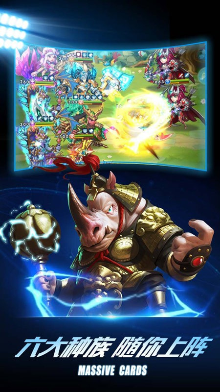 3、回归初始的卡牌玩法,去掉繁琐的操作选择,百名特色英雄重装出阵,不同的技能灵位属性,满足你的集邮式体验。