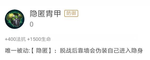 隐匿胄甲:脱战靠墙隐身,适合任何英雄,提高生存能力,轻松苟到前三;
