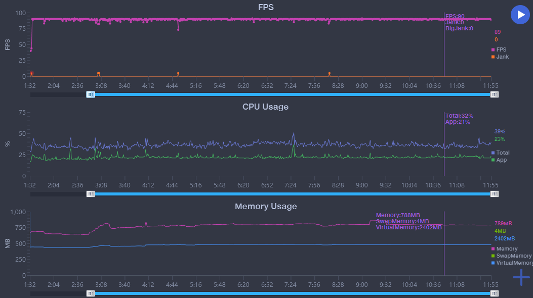 最后我们测试的《QQ飞车》,在90Hz屏幕刷新率的加持下,游戏的整体流畅度表现非常不错,基本保持在90帧的水平。