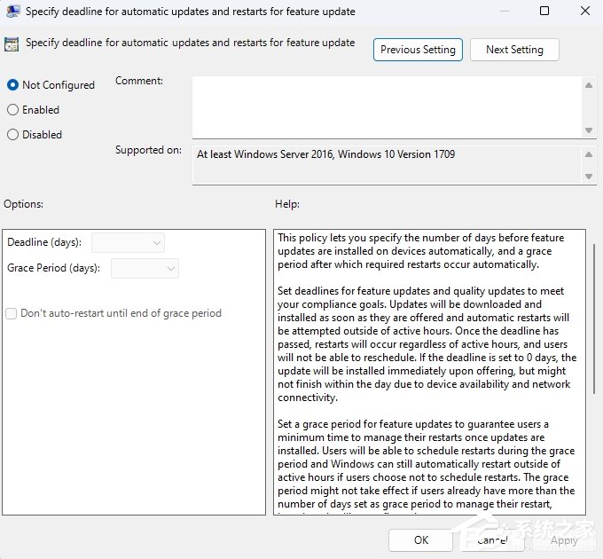 组策略设置“指定自动更新的截止日期并重新启动功能更新”的屏幕截图。