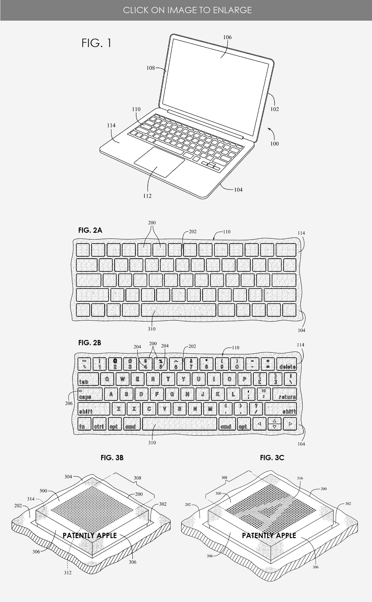 苹果公司指出,该键盘的键帽可以用传统键盘的键帽通常不会使用到的材料(例如铝)制成。因此,键盘的键帽可以有与键盘的外壳表面的外观相匹配的顶面,而键盘的键帽周围也可以有金属表面。