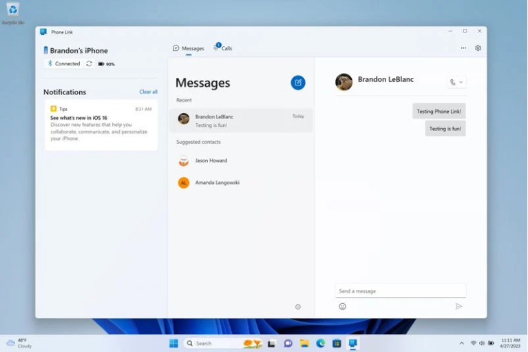 通过 Windows 11 上的 Phone Link 应用和 iOS 上的 Link to Windows 应用,iPhone 用户可以直接在电脑上接打电话、收发短信和查看通知。这意味着 Windows 11 可以间接支持 iMessage,不过系统之家注意到有一些限制,比如不支持群聊、图片、视频和历史记录等。