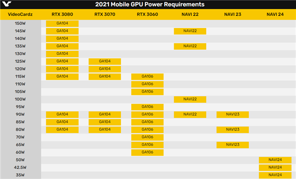 VideoCardz根据传闻,整理了AMD Navi 22/23/24三种不同核心在笔记本上的功耗档次,并对比了已上市的NVIDIAG A104/GA106核心笔记本显卡功耗。