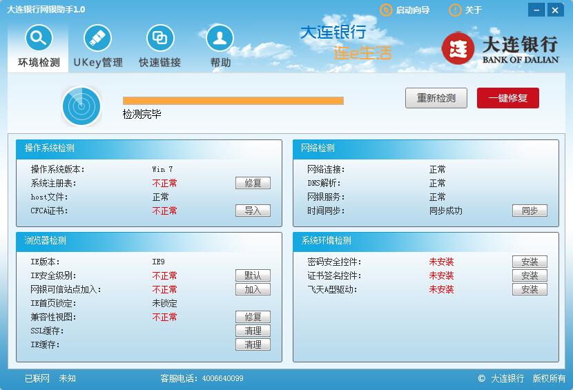 大连银行网银助手是一款小巧专业的网上银行安全辅助工具,此款软件功能强劲,便捷好用,支持进行Ukey管理,帮助用户一次性完成所有控件、驱动程序安装,集成化安装非常的简单易用。