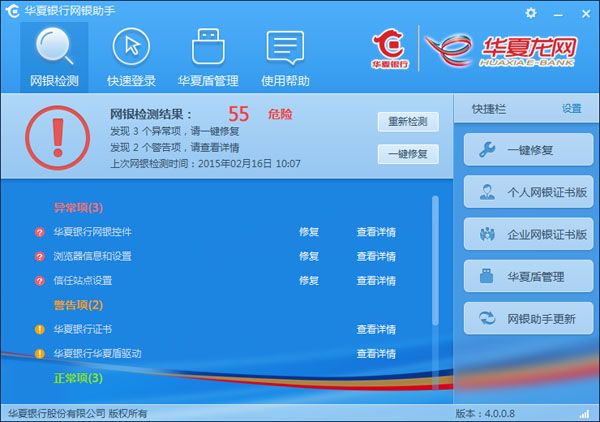 现在大家使用网银都比较频繁,但是如果使用环境不安全的话,那么指不准就会带来许多不必要的损失。华夏银行网银助手是华夏银行官方推出的一款网银安全工具,能检测您的电脑环境,一键修复华夏盾驱动、自动配置网银信任站点、安装网银控件等相关问题。让你网银交易更放心、更安全。