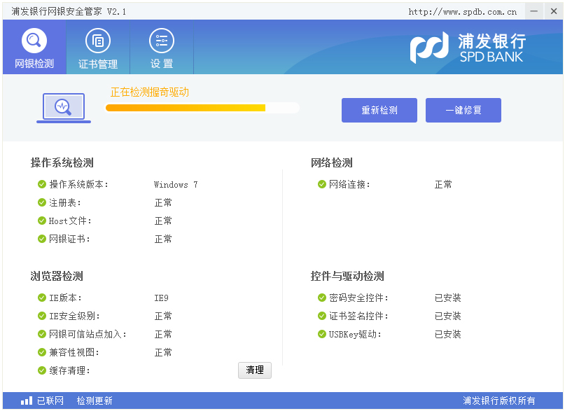 安装完毕后,首次运行时,请选择您的用户类型,公司网银专业版用户还需选择您的U-KEY品牌类型。随后,浦发网银管家将自动完成首次扫描,并在检测完毕后,提示您点击“一键修复”按钮,快速完成所需的各项安装、修复及设置,期间请确保您的网络畅通, 达到最佳体验效果。