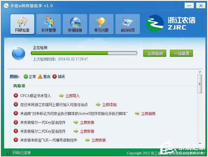 浙江农信网银助手是能一键检测修复的网银交易安全辅助软件,通过下载并安装丰收e网网银助手免费版并点击“一键修复”按钮,电脑即可达到使用浙江农信网银所需的安全配置环境。