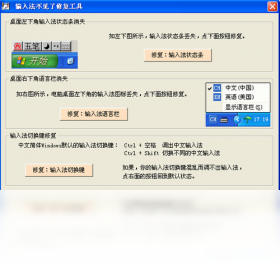 输入法不见了修复工具是一款一键修复输入法图标消失及输入法切换问题的工具。遇到电脑桌面右下角的语言栏消失、输入法状态栏不显示,无法用鼠标点击软件键盘,以及用系统默认的ctrl+空格快捷键无法切换出中文,也无法用ctrl+shift在不同的中文输入法进行切换的问题时,使用此工具,轻点两下鼠标,即可自动恢复为默认状态。