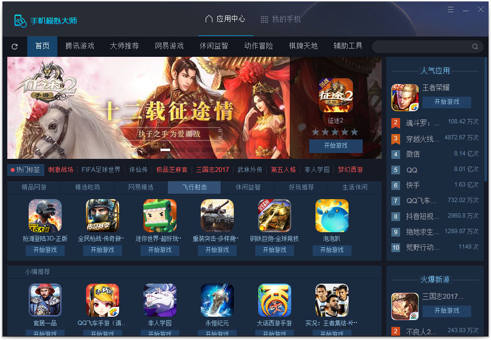 手机模拟大师支持QQ、微信等生活常用应用,同时也支持王者荣耀、阴阳师等手机游戏。手机模拟大师拥有全面的游戏资源,便利的操作,流畅的软件性能,让玩家完全脱离手机的电量、发烫、老化等问题,在PC电脑上获得更佳的体验。