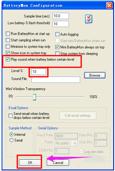 勾选“低电量时报警”,同时设置电量阈值,并选择相应的音乐文件地址,点击“OK”按钮即可。