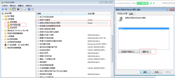 2、运行里输入secpol.msc启动“本地安全策略”-“用户权限分派”-将“拒绝从网络访问这台计算机”里面的guest用户删除。
