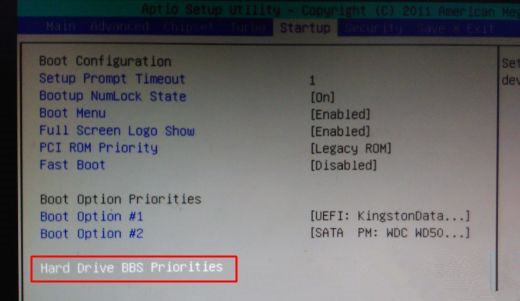 5、如果是以下界面,切换到Boot或Startup,选择Hard Drive BBS Priorities回车;