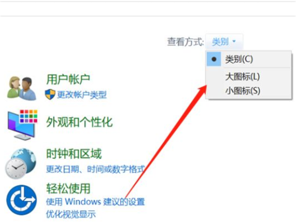 2、打开进入控制面板后,我们看到有很多种类的功能,点击一下右上角的“查看方式”。