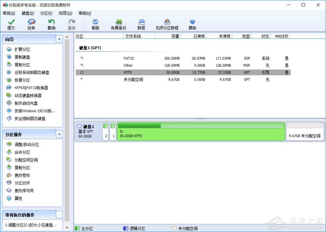3、点击上面有C的绿条,然后点击右键,点击右键菜单中的“调整/移动分区”,这里我主要想把C盘大小设置成50GB,多余的空间用于创建新分区;直接把“分区大小(S)”后面的59.67GB改成50GB,点击确定按钮。
