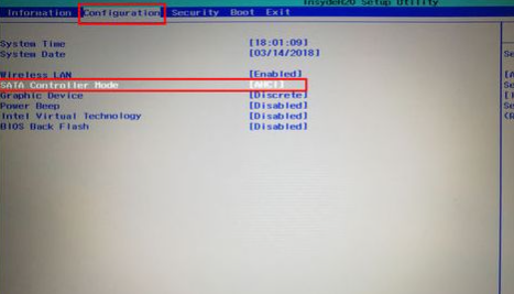 2、进入bios后,使用左右方向键移动到”Configuration”菜单,我们找到”SATA Controller Mode”,选项并按下回车键,将其设置为ACHI模式。