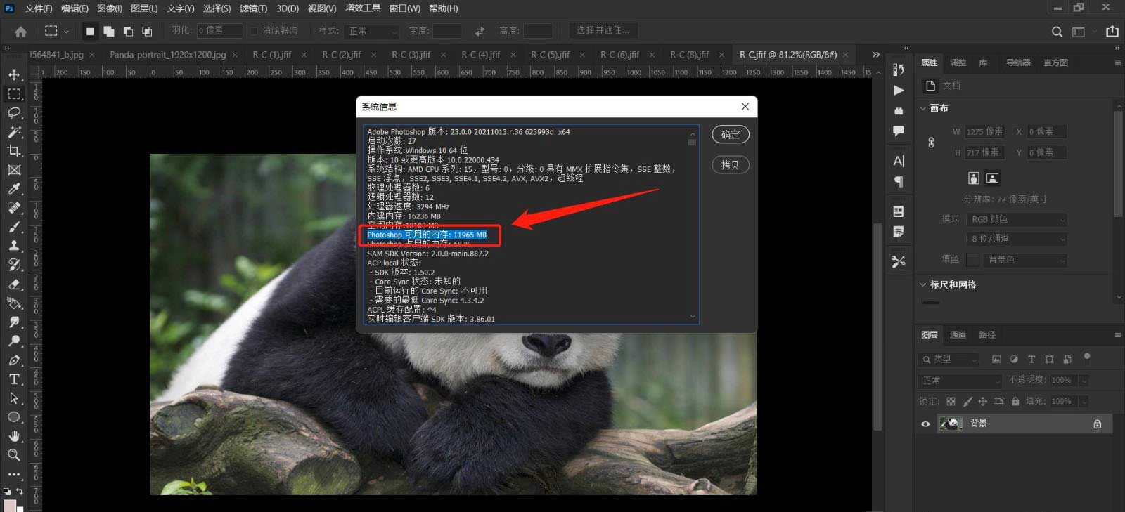 如图在打开的“系统信息”面板查看Photoshop可用内存即可;