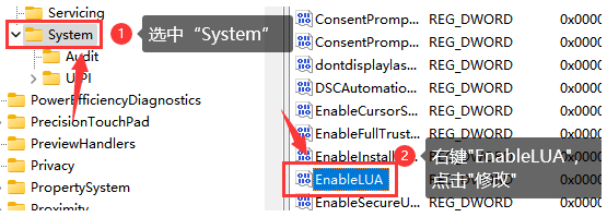 2、打开注册表编辑器后,在system文件夹中右键点击enableLUA选项打开修改窗口。